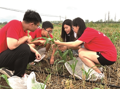 中國農業(yè)大學曲周科技小院學生在田間查看玉米苗生長情況。(劉錚/攝)