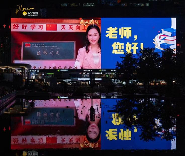 9月10日晚8點,江北嘴大劇院、渝中區(qū)WFC環(huán)球金融中心、南濱路喜來登、解放碑商圈、觀音橋商圈等標(biāo)志性建筑的大型LED屏幕“準(zhǔn)時亮燈”,一直持續(xù)到晚上9點?!肮虊?,強(qiáng)國有我”“老師,您好!教師節(jié)快樂!”“老師,您辛苦了!”等教師節(jié)祝福語和教師節(jié)主題海報滾動播放,表達(dá)了對全市教育工作者的節(jié)日祝福和誠摯問候。