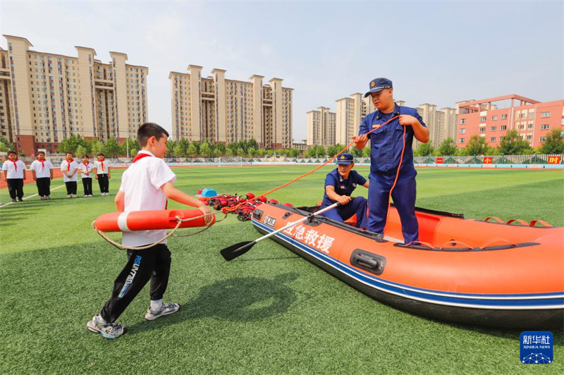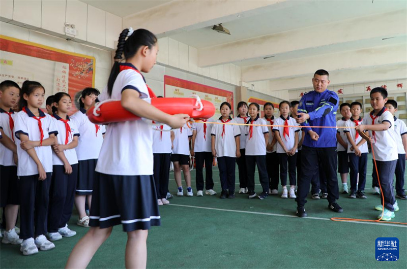 1/06月27日,在河北省秦皇島市盧龍縣第五實(shí)驗(yàn)小學(xué),消防救援人員向?qū)W生演示實(shí)施水上救援。(新華社發(fā) 劉滿倉/攝)
