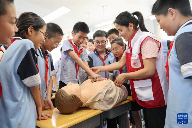 1/06月27日,在山東省臨沂第二實(shí)驗(yàn)小學(xué)蒙山校區(qū),當(dāng)?shù)丶t十字會(huì)志愿者指導(dǎo)學(xué)生體驗(yàn)心肺復(fù)蘇技能。(新華社發(fā) 許傳寶/攝)