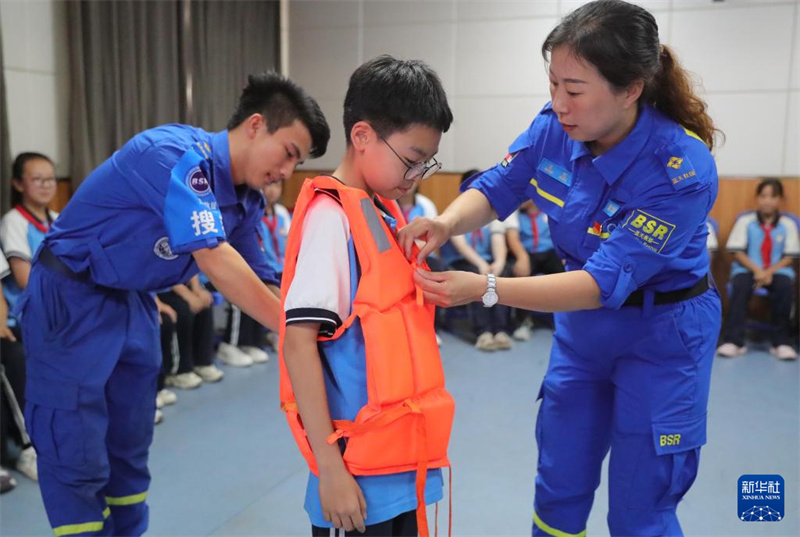 1/06月27日,在河北省秦皇島市海港區(qū)東港鎮(zhèn)第一小學(xué),藍(lán)天救援隊(duì)隊(duì)員為學(xué)生講解救生衣的穿戴方法。(新華社發(fā) 曹建雄/攝)