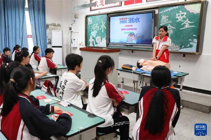 1/06月27日,四川省廣安市廣安區(qū)紅十字會(huì)志愿者在廣安中學(xué)向?qū)W生普及心肺復(fù)蘇等溺水救護(hù)常識(shí)。(新華社發(fā) 廖小兵/攝)