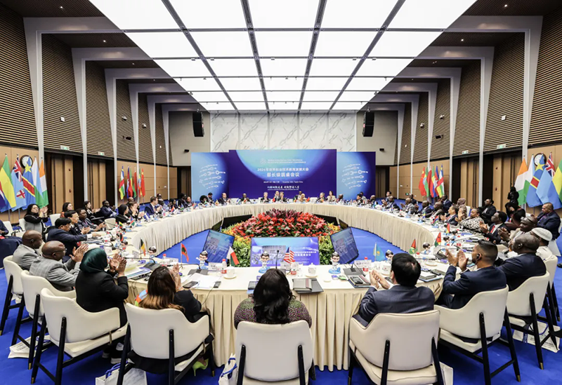 在2024年世界職業(yè)技術(shù)教育發(fā)展大會上,32國部長聯(lián)合發(fā)布“天津共識”。(中國教育報記者 張勁松/攝)