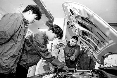 江西省輕工業(yè)高級(jí)技工學(xué)校新能源汽車運(yùn)用與維修專業(yè)學(xué)生在老師的指導(dǎo)下學(xué)習(xí)新能源汽車電池故障診斷技術(shù)要領(lǐng)。(周亮攝/光明圖片)
