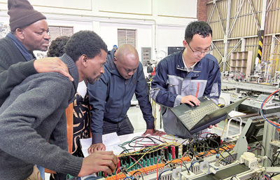 在南非國家技能中心,來自中國常州信息職業(yè)技術(shù)學(xué)院的教師正在對當(dāng)?shù)貙W(xué)員進(jìn)行機(jī)電一體化培訓(xùn)。(本報非洲中心分社 希拉茲·莫林/攝)
