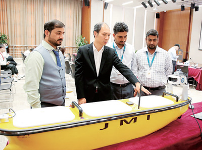 阿聯(lián)酋鄭和學(xué)院(阿布扎比)的中方教師,正在向當(dāng)?shù)貙W(xué)員介紹“海涵1號”無人船。(本報中東中心分社 塔里克·易卜拉欣/攝)