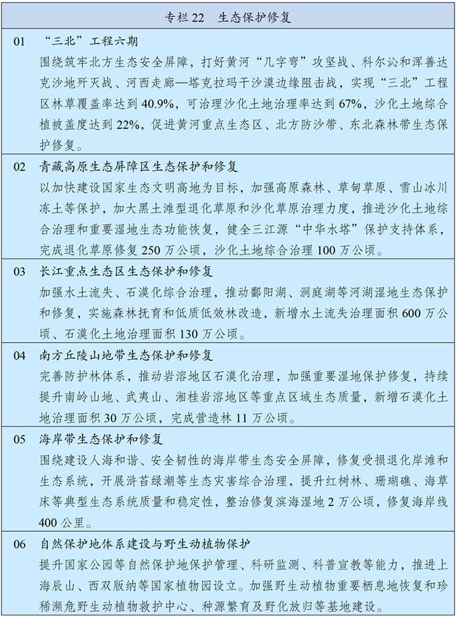 統(tǒng)籌推進(jìn)重要生態(tài)系統(tǒng)保護(hù)和修復(fù)重大工程,持續(xù)鞏固以“三區(qū)四帶”為骨架的國家生態(tài)安全屏障體系。打好“三北”工程攻堅(jiān)戰(zhàn),推動(dòng)三大標(biāo)志性戰(zhàn)役取得決定性勝利。深入推進(jìn)青藏高原生態(tài)保護(hù),加強(qiáng)重點(diǎn)區(qū)域水土流失治理和石漠化治理??茖W(xué)開展大規(guī)模國土綠化行動(dòng),推進(jìn)森林質(zhì)量精準(zhǔn)提升和國家儲(chǔ)備林建設(shè),森林蓄積量達(dá)到224億立方米,統(tǒng)籌草原生態(tài)修復(fù)與合理利用,加強(qiáng)濕地保護(hù)修復(fù)。推進(jìn)超引地表水和超采地下水治理,開展歷史遺留廢棄礦山生態(tài)修復(fù)。