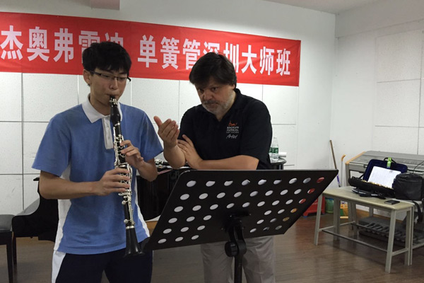 5月5日,意大利“國寶”級單簧管大師科拉多o杰奧弗雷迪Corrado Giuffredi來訪深圳藝術(shù)學(xué)校,在學(xué)校音樂廳舉行了單簧管獨(dú)奏音樂會。三百座的音樂廳坐滿了得到消息慕名前來一睹大師風(fēng)采的深圳交響樂團(tuán)的管樂演奏家,藝校的管樂專業(yè)學(xué)生及家長悉數(shù)到場聆聽。講座還吸引了深圳管弦樂協(xié)會和廣州星海音樂學(xué)院的學(xué)子前來。5月6日,幸運(yùn)的單簧管學(xué)子在接受大師的親自教導(dǎo)后,表示在對音樂和藝術(shù)的理解上都有了新的提高,更加堅定了要成為出色演奏家的職業(yè)理想。