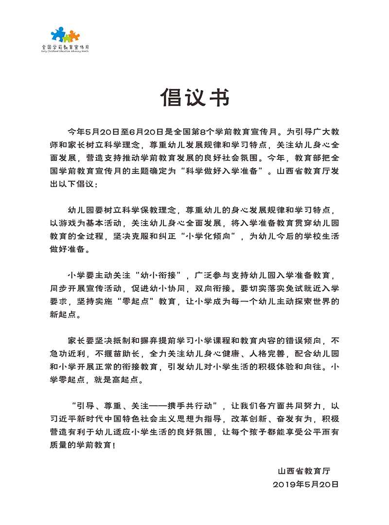 根據(jù)教育部部署,今年5月20日—6月20日為第八個(gè)全國學(xué)前教育宣傳月,活動(dòng)主題為“科學(xué)做好入學(xué)準(zhǔn)備”。5月20日上午,2019年學(xué)前教育宣傳月活動(dòng)山西省啟動(dòng)儀式在太原市杏花嶺區(qū)新建路小學(xué)富力華庭分校舉行。省教育廳黨組成員、副廳長任月忠出席活動(dòng)并講話。省委編辦、省發(fā)展改革委、省公安廳、省財(cái)政廳、省人力資源社會(huì)保障廳、省自然資源廳、省住房城鄉(xiāng)建設(shè)廳、省衛(wèi)生健康委等部門相關(guān)負(fù)責(zé)同志出席啟動(dòng)儀式。來自全省高校、教研機(jī)構(gòu)、小學(xué)以及幼兒園的專家、校長、園長、教師、家長及社區(qū)代表近500人參加啟動(dòng)儀式。