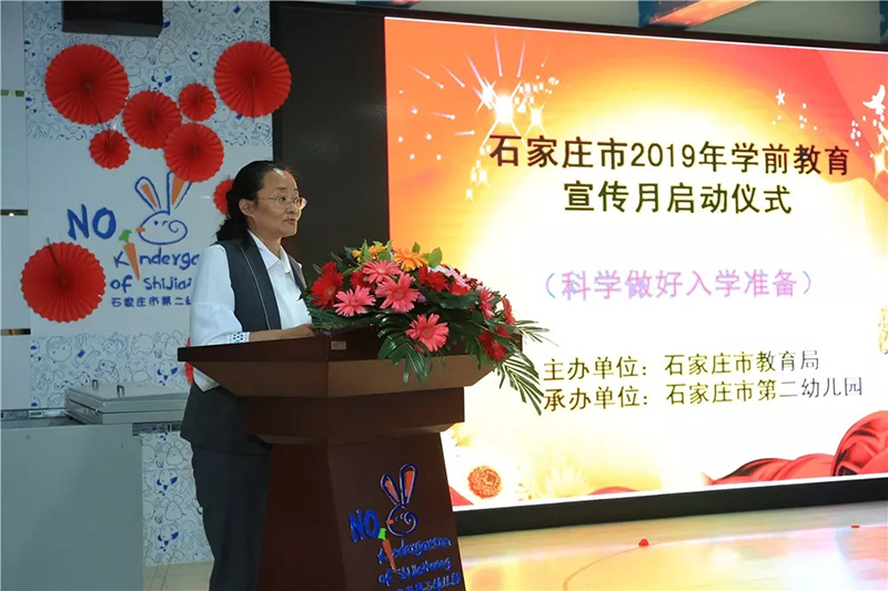 在石家莊市第二幼兒園活動(dòng)現(xiàn)場(chǎng),新華區(qū)教育局局長(zhǎng)張輝致歡迎詞。趙立芬講話(huà)中指出,各地要認(rèn)真貫徹落實(shí)黨的十九大關(guān)于“辦好學(xué)前教育”的要求,在“幼有所育”等方面不斷取得新進(jìn)展。大力實(shí)施《3--6歲兒童學(xué)習(xí)與發(fā)展指南》,組織開(kāi)展小學(xué)招生情況大排查、幼兒園“小學(xué)化”大研討、“幼小銜接”大教研、家長(zhǎng)教育大課堂、校外培訓(xùn)機(jī)構(gòu)“小學(xué)化”大整頓等五大系列活動(dòng),正本清源、標(biāo)本兼治,切實(shí)做好專(zhuān)項(xiàng)治理工作。今年學(xué)前教育宣傳月的活動(dòng)主題是:科學(xué)做好入學(xué)準(zhǔn)備。各地圍繞主題,開(kāi)展形式多樣的宣傳活動(dòng),進(jìn)一步提高公眾對(duì)學(xué)前教育科學(xué)性的認(rèn)識(shí),全面促進(jìn)學(xué)前教育科學(xué)健康發(fā)展。趙立芬強(qiáng)調(diào),各地要做好長(zhǎng)遠(yuǎn)規(guī)劃,建立長(zhǎng)效機(jī)制,教育行政部門(mén)和幼兒園要明確宣傳活動(dòng)任務(wù)和工作責(zé)任,切實(shí)把學(xué)前教育的大好政策、先進(jìn)理念、科學(xué)育兒方式等變成全社會(huì)的共識(shí),力求在工作中融入宣傳、在宣傳中推動(dòng)工作。同時(shí),對(duì)“小學(xué)化”專(zhuān)項(xiàng)治理工作突出的縣(市、區(qū))表示了肯定,并就下一步重點(diǎn)工作進(jìn)行了安排部署。隨后,石家莊市第二幼兒園的師生準(zhǔn)備了精彩的文藝節(jié)目,動(dòng)感十足的《籃球?qū)氊悺泛统錆M(mǎn)童趣的《一只有教養(yǎng)的狼》《帽子游戲》。老師們帶來(lái)了舞蹈《芳華》,用優(yōu)美的舞姿表達(dá)了對(duì)幼兒教育的熱愛(ài),在最美的年華里,奉獻(xiàn)著自己全部的青春和熱情。