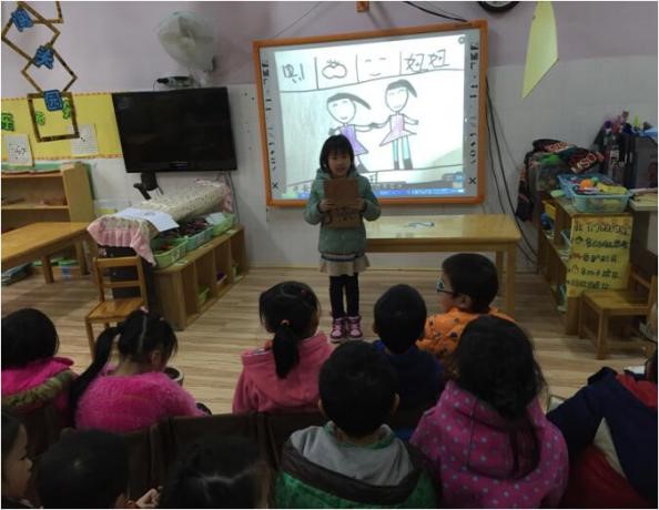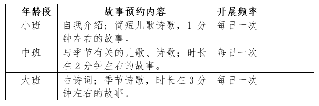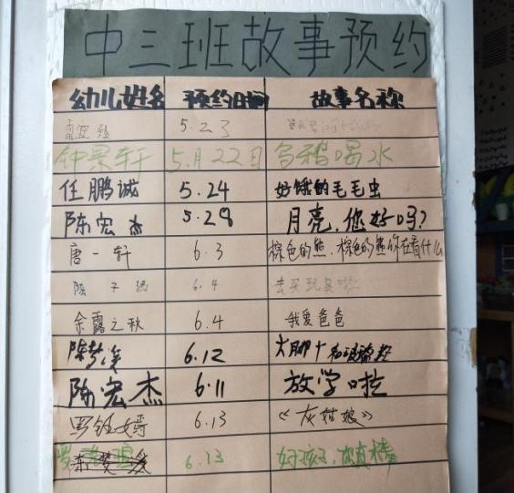 語言是在日常的運用中發(fā)展起來的,因此,創(chuàng)設(shè)語言氛圍,建立常規(guī)的語言活動形式很關(guān)鍵。依據(jù)兒童的發(fā)展水平,我園從小班就開始“故事預(yù)約”活動。年齡段不同,“故事預(yù)約”的內(nèi)容也就不同。幼兒通過自主預(yù)約講述的時間、準備故事(閱讀書籍、練習故事)、講述故事,不僅綜合培養(yǎng)了幼兒的前閱讀能力、講述能力、傾聽能力以及評價他人的能力,在每天“人人參與”的“故事預(yù)約”活動,幼兒的自信心也得到了很好的發(fā)展,同時,幼兒餐前、餐后、離園前后的時間變得更加有意義。