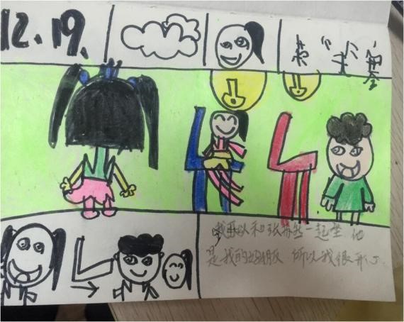 班級每天以小任務(wù)的方式,將心情記錄布置給孩子,第二天在入園后的自由活動中與同伴、老師進行個別交流或集體交流。即培養(yǎng)了任務(wù)意識,前書寫能力,又學會了分享和自我情緒的調(diào)適。