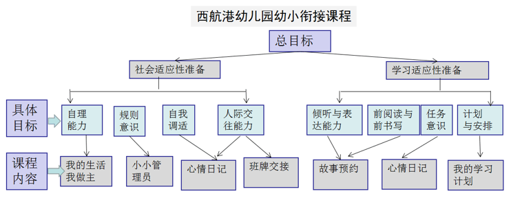 在落實以上常規(guī)活動以外,我們更著力從幼兒自理能力、規(guī)則意識、時間觀念、任務(wù)意識、人際交往、計劃與安排、語言傾聽與表達、閱讀與書寫等方面,系統(tǒng)思考,整體規(guī)劃,以課程的方式來落實幼兒的幼小銜接工作:
