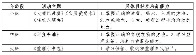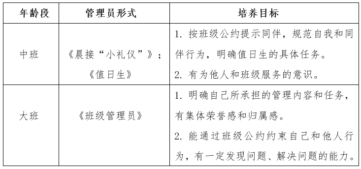 根據(jù)年齡段的不同,“小小管理員”所涉及的內(nèi)容也有所不同,我們具體將活動細分為如下。