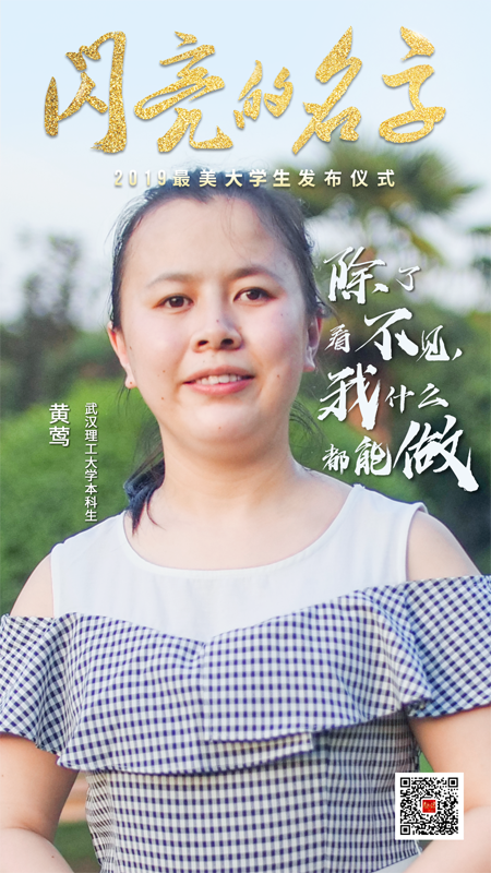 兩歲那年的一次高燒,讓黃鶯成為了一個雙目失明的女孩。生活在黑暗世界中的她卻對生活充滿了希望,她始終堅(jiān)信:“除了看不見,我什么都能做。”6歲那年,在她的不懈堅(jiān)持下,父母將她送入寧夏特殊教育學(xué)校學(xué)習(xí)。在學(xué)校中,疊被子、洗衣服等等一切都要靠幼小的她獨(dú)立完成。黃鶯沒有氣餒和放棄,而是勇敢地面對了生命的殘缺。初中畢業(yè)后,大部分盲人學(xué)生都選擇了接受盲人職業(yè)教育,但她不愿屈服于命運(yùn)的安排,立志要通過自己的努力拓寬盲人群體的就業(yè)之路。為了夢想,她積極爭取到參加青島盲校中考的機(jī)會,雖不幸落榜,但她毅然選擇了復(fù)讀。兩年后,黃鶯以全國第四的成績考入了青島盲校普通高中部,“大學(xué)夢”成為了她新的奮斗目標(biāo)。2015年6月,她作為寧夏首位參加普通高考的盲人學(xué)生,以高出當(dāng)?shù)乩砜埔槐揪€85分的成績被武漢理工大學(xué)社會工作專業(yè)錄取。