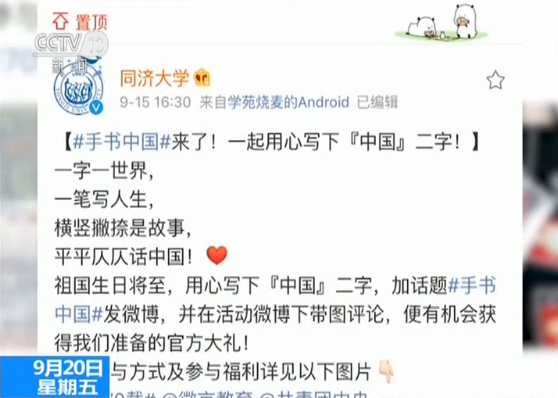在網(wǎng)絡(luò)陣地,西南交通大學(xué)發(fā)起愛(ài)要大聲說(shuō)出來(lái)#我給祖國(guó)表個(gè)白#網(wǎng)絡(luò)活動(dòng),閱讀量已經(jīng)上千萬(wàn);同濟(jì)大學(xué)推出的“手書(shū)中國(guó) 青春告白”網(wǎng)上話題引起廣泛參與,同學(xué)們還自發(fā)開(kāi)展起以此為主題的線下活動(dòng),用行動(dòng)書(shū)寫(xiě)出對(duì)祖國(guó)的愛(ài)。