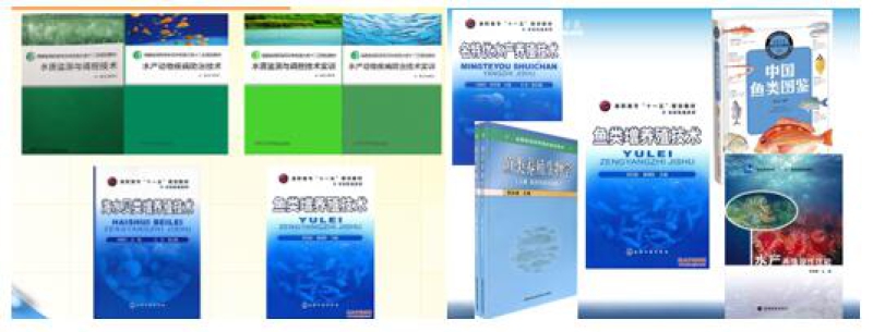 從培養(yǎng)目標(biāo)出發(fā),科學(xué)選用最前沿最實用的培訓(xùn)教材,增強應(yīng)用性,注重實際操作技能的培養(yǎng)突出易學(xué)、適用特色。目前已完成各類規(guī)劃教材《魚類增養(yǎng)殖技術(shù)》、《蝦蟹類增養(yǎng)殖技術(shù)》、《海水貝類增養(yǎng)殖技術(shù)》等12本(見表2、圖8)。