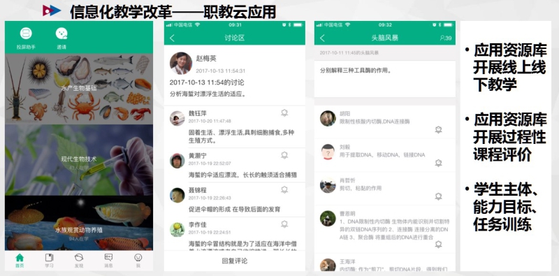 利用國家級職業(yè)教育“水產(chǎn)養(yǎng)殖技術(shù)專業(yè)教學(xué)資源庫”平臺開展線上線下混合式教學(xué)。農(nóng)忙時節(jié),以手機“云課堂APP”為主(見圖12),學(xué)員通過手機在“田間地頭”隨時隨地點擊“云課堂”在線學(xué)習(xí),實時通過傳送文字、照片與視頻等方式咨詢問題,并及時得到專家回復(fù)。農(nóng)閑時節(jié)以“線下”面對面直接交流為主,這種“線上線下”配合的“混合式”教學(xué)為新型職業(yè)農(nóng)民培育注入新活力,激發(fā)新動力。