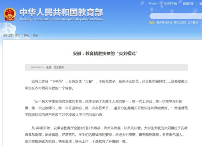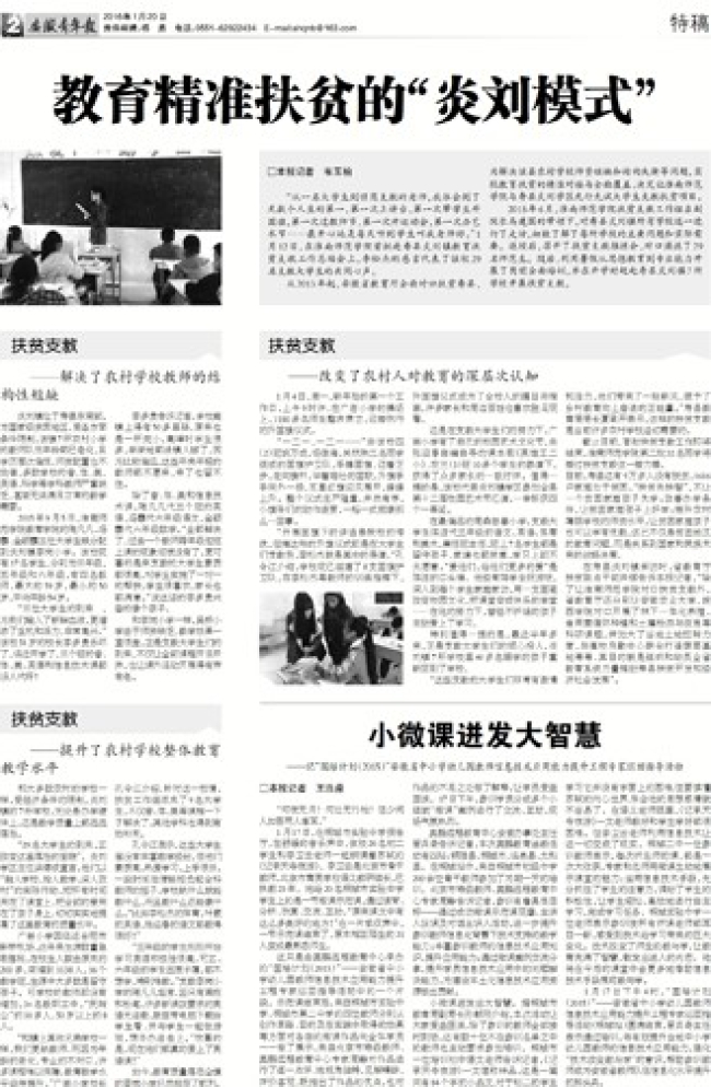 學(xué)校精準扶貧頂崗支教的“炎劉模式”,受到各界關(guān)注,教育部官方網(wǎng)站將我校教育精準扶貧的“炎劉模式”定格為“教改新舉措”,予以高度評價。