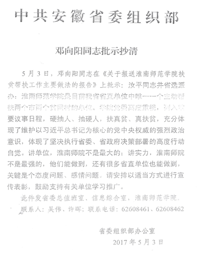 由于我校扶貧定崗實習(xí)支教的“炎劉模式”影響逐步擴大,2016年按照淮南市統(tǒng)一部署,學(xué)校主動服務(wù)地方精準扶貧大局,結(jié)對幫扶壽縣炎劉鎮(zhèn)磨灣村。2016年5月,時任省委常委、省委組織部部長鄧向陽同志對學(xué)校定點幫扶工作作出批示,對學(xué)校幫扶做法給予高度肯定,明確提出“安排以適當方式進行宣傳表彰,鼓勵支持有關(guān)單位學(xué)習(xí)推廣”。