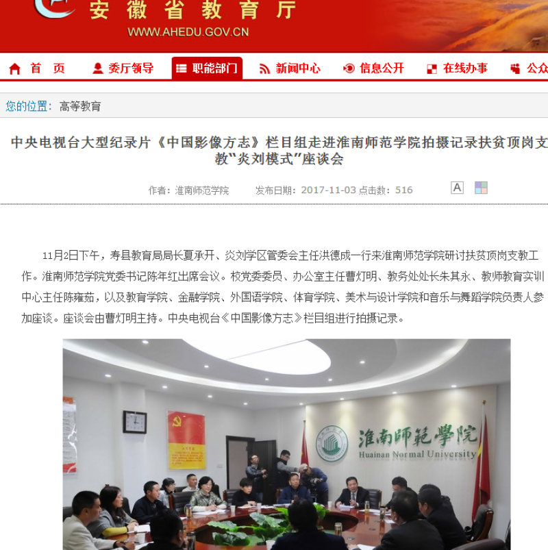 2017年11月2日,中央電視臺大型紀錄片《中國影像方志》欄目組走進淮南師范學(xué)院拍攝記錄扶貧頂崗實習(xí)支教“炎劉模式”素材。