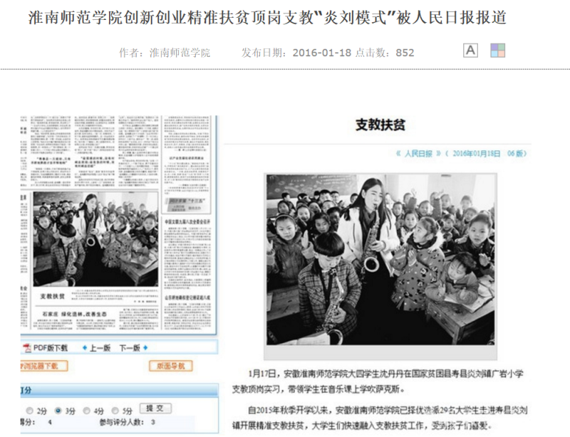 淮南師范學(xué)院精準扶貧支教工作得到了廣泛關(guān)注,支教學(xué)生們在實踐中得到了鍛煉,為學(xué)校贏得了榮譽,為貧困鄉(xiāng)村教育發(fā)展做出了貢獻?!度嗣袢請蟆?、《中國青年報》、《安徽日報》、《安徽青年報》、CCTV音樂、教育部官方網(wǎng)站、安徽電視臺、安徽高教網(wǎng)、光明網(wǎng)等新聞媒體進行了采訪報道。學(xué)校精準扶貧頂崗支教的“炎劉模式”榮獲淮南市2017年度“優(yōu)秀志愿服務(wù)項目”。