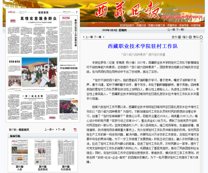 自2010年以來,西藏職業(yè)技術(shù)學(xué)院已先后有七批工作隊(duì)員100多名教師連續(xù)8年在日喀則市定日縣扎西宗鄉(xiāng)開展創(chuàng)先爭優(yōu)強(qiáng)基惠民駐村工作,為當(dāng)?shù)剜l(xiāng)村經(jīng)濟(jì)發(fā)展帶來了巨大變化。學(xué)院實(shí)施開展了“筑夢行動‘一二三七十’項(xiàng)目”,為老百姓排憂解難,推進(jìn)扶貧脫貧開發(fā)任務(wù),切實(shí)加強(qiáng)和推進(jìn)了各項(xiàng)強(qiáng)基惠民工作,有效夯實(shí)了基層發(fā)展穩(wěn)定的根基,得到了當(dāng)?shù)卮迕癜傩蘸忘h委政府的高度肯定,較好樹立了西藏職業(yè)技術(shù)學(xué)院駐村工作的品牌?,F(xiàn)將“筑夢行動‘一二三七十’項(xiàng)目”介紹如下: