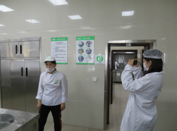 此次口岸中學(xué)之行記者首先來到了口岸中學(xué)的食堂。為了保持食堂環(huán)境的干凈衛(wèi)生,記者戴上了一次性口罩、帽子,穿上消毒的工作服后開始了采訪、拍攝工作。