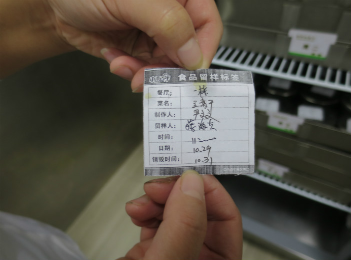 食堂工作人員向記者展示食品留樣標(biāo)簽