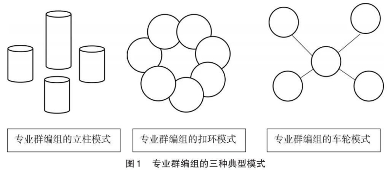當然,由于本科教育與高職教育專業(yè)群組建的目的不同,因而它們對知識的邏輯要求也有所不同。本科教育組建專業(yè)群的主要目的是促進學術(shù)知識的生產(chǎn),因此其更多地從科學研究突破的角度尋求專業(yè)群編組的知識邏輯;高職教育組建專業(yè)群的主要目的是促進技能型人才培養(yǎng),因此它更多地應(yīng)從復(fù)合型應(yīng)用人才培養(yǎng)的角度尋求知識邏輯。職業(yè)類別的多樣化決定了高職教育專業(yè)群編組需要采取不同模式,常見模式有立柱模式、扣環(huán)模式和車輪模式。立柱模式的特點是群內(nèi)有一個作為支柱的專業(yè),其他專業(yè)依附它而發(fā)展;扣環(huán)模式的特點是群內(nèi)各專業(yè)之間是交叉、并列關(guān)系,沒有哪個專業(yè)能發(fā)揮絕對的支柱或中心作用;車輪模式的特點是群內(nèi)有一個居于中心地位的專業(yè),但它與群內(nèi)其他專業(yè)之間的關(guān)系是平面的(見圖1)。