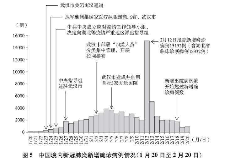 全國新增確診病例快速增加,防控形勢異常嚴峻。中國采取阻斷病毒傳播的關鍵一招,堅決果斷關閉離漢離鄂通道,武漢保衛(wèi)戰(zhàn)、湖北保衛(wèi)戰(zhàn)全面打響。中共中央成立應對疫情工作領導小組,并向湖北等疫情嚴重地區(qū)派出中央指導組。國務院先后建立聯(lián)防聯(lián)控機制、復工復產(chǎn)推進工作機制。全國集中資源和力量馳援湖北省和武漢市。各地啟動重大突發(fā)公共衛(wèi)生事件應急響應。最全面最嚴格最徹底的全國疫情防控正式展開,疫情蔓延勢頭初步遏制。(圖5)