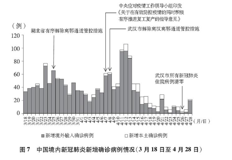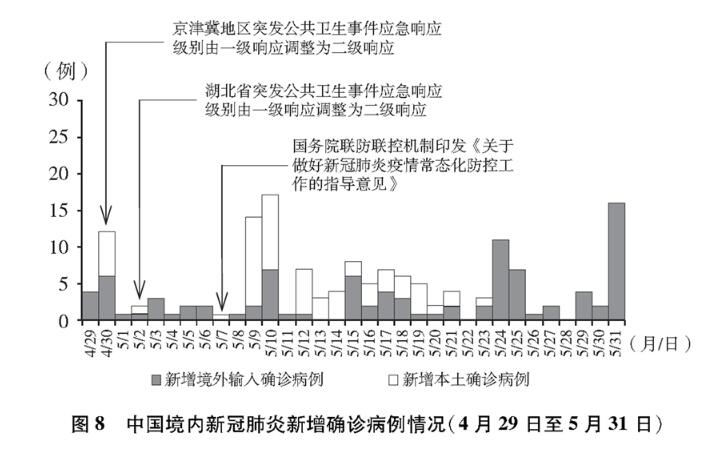 境內(nèi)疫情總體呈零星散發(fā)狀態(tài),局部地區(qū)出現(xiàn)散發(fā)病例引起的聚集性疫情,境外輸入病例基本得到控制,疫情積極向好態(tài)勢持續(xù)鞏固,全國疫情防控進入常態(tài)化。加大力度推進復工復產(chǎn)復學,常態(tài)化防控措施經(jīng)受“五一”假期考驗。經(jīng)中共中央批準,國務院聯(lián)防聯(lián)控機制派出聯(lián)絡組,繼續(xù)加強湖北省疫情防控。(圖8)