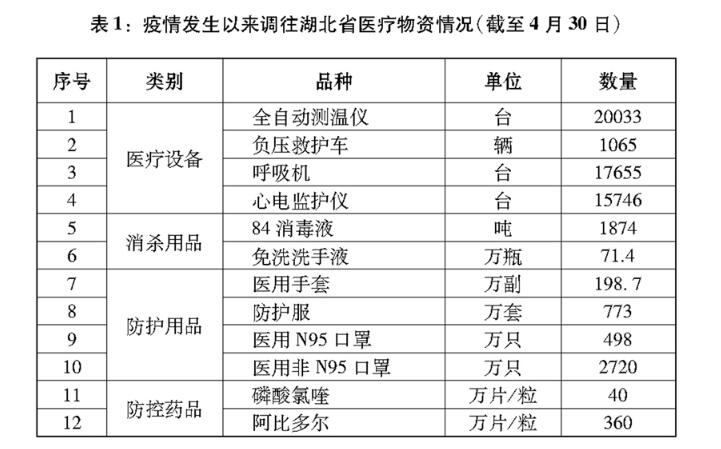 開展新中國成立以來規(guī)模最大的醫(yī)療支援行動。調(diào)動全國醫(yī)療資源和力量,全力支持湖北省和武漢市醫(yī)療救治。自1月24日除夕至3月8日,全國共調(diào)集346支國家醫(yī)療隊、4.26萬名醫(yī)務人員、900多名公共衛(wèi)生人員馳援湖北。19個省份以對口支援、以省包市的方式支援湖北省除武漢市以外16個地市,各省在發(fā)生疫情、防控救治任務十分繁重的情況下,集中優(yōu)質(zhì)醫(yī)療資源支援湖北省和武漢市。人民解放軍派出4000多名醫(yī)務人員支援湖北,承擔火神山醫(yī)院等3家醫(yī)療機構(gòu)的醫(yī)療救治任務,空軍出動運輸機緊急運送醫(yī)療物資。各醫(yī)療隊從接受指令到組建2小時內(nèi)完成,24小時內(nèi)抵達,并自帶7天防護物資,抵達后迅速開展救治。在全國緊急調(diào)配全自動測溫儀、負壓救護車、呼吸機、心電監(jiān)護儀等重點醫(yī)療物資支援湖北省和武漢市(表1)。從全國調(diào)集4萬名建設者和幾千臺機械設備,僅用10天建成有1000張病床的火神山醫(yī)院,僅用12天建成有1600張病床的雷神山醫(yī)院。短短10多天建成16座方艙醫(yī)院,共有1.4萬余張床位。加強臨床血液供應,10個省份無償支援湖北省紅細胞4.5萬單位,血小板1762個治療量,新鮮冰凍血漿137萬毫升(不含恢復期血漿)。大規(guī)模、強有力的醫(yī)療支援行動,有力保障了湖北省和武漢市救治,極大緩解了重災區(qū)醫(yī)療資源嚴重不足的壓力。