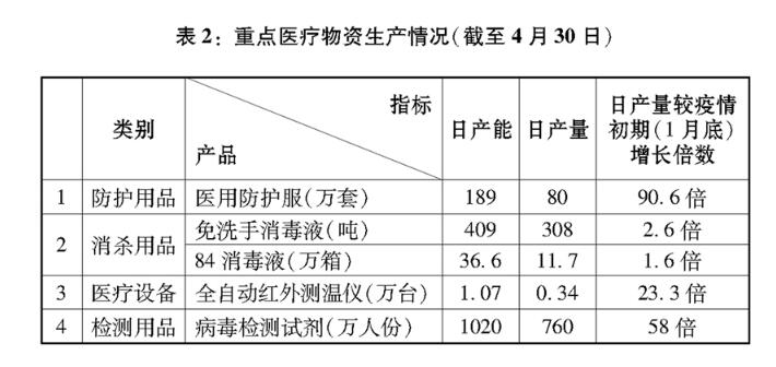 大力加強醫(yī)療物資生產(chǎn)供應和醫(yī)療支持服務。疫情防控阻擊戰(zhàn),也是后勤保障戰(zhàn)。疫情初期,武漢市醫(yī)療防護物資極度短缺,為了節(jié)省防護用品、爭分奪秒搶救病患,一線醫(yī)護人員克服困難,最大限度地延長防護用品使用時間。為盡快解決醫(yī)療資源短缺和病患急劇增多的突出矛盾,中國充分發(fā)揮制造業(yè)門類全、韌性強和產(chǎn)業(yè)鏈完整配套的優(yōu)勢,克服春節(jié)假期停工減產(chǎn)等不利因素,開足馬力,深挖潛力,全力保障上下游原料供應和物流運輸,保證疫情防控物資的大規(guī)模生產(chǎn)與配送。醫(yī)療企業(yè)克服工人返崗不足等困難,以最快速度恢復醫(yī)療用品生產(chǎn),最大限度擴大產(chǎn)能。其他行業(yè)企業(yè)迅速調(diào)整轉(zhuǎn)產(chǎn),生產(chǎn)口罩、防護服、消毒液、測溫儀等防疫物資,有效擴大了疫情防控物資的生產(chǎn)供應??焖賳臃揽蒯t(yī)療物資應急審批程序,全面加強質(zhì)量安全監(jiān)管,確保以最快的速度批準上市、促產(chǎn)保供,截至5月31日,共應急批準17個藥物和疫苗的19件臨床試驗申請,附條件批準2個疫情防控用藥上市。在各方共同努力下,醫(yī)用物資產(chǎn)能不斷提升,醫(yī)用物資保供實現(xiàn)從“緊缺”到“緊平衡”“動態(tài)平衡”“動態(tài)足額供應”的跨越式提升(表2)。2月初,醫(yī)用非N95口罩、醫(yī)用N95口罩日產(chǎn)量分別為586萬只、13萬只,到4月底分別超過2億只、500萬只。暢通供應鏈條和物流渠道,建立聯(lián)保聯(lián)供協(xié)作機制,源源不斷地把全國支援物資運送到疫情防控重點地區(qū)。