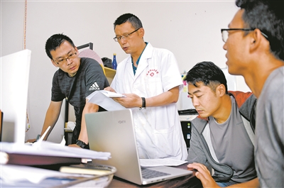 在金陽縣桃坪鄉(xiāng)政府辦公室,張抗(左一)與幫扶隊員一起整理下鄉(xiāng)走訪資料,掛職鄉(xiāng)衛(wèi)生院的醫(yī)生甘文建(左二)就慢性病貧困戶后續(xù)幫扶工作提出自己的建議。