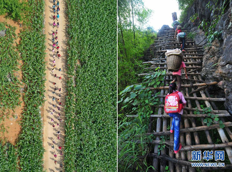 拼版照片:左圖為在廣西大化瑤族自治縣板升鄉(xiāng)弄勇村,孩子們走在放學(xué)路上(2019年5月10日攝,無(wú)人機(jī)照片);右圖為在弄勇村弄頂屯,孩子們扛著生活用具,爬懸梯回家(2012年7月4日攝)。目前,弄勇村所有的屯都已告別沒有公路的歷史。(新華社記者 黃孝邦/攝)