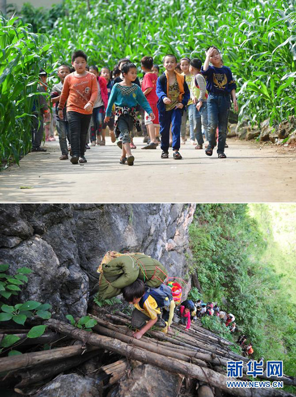 拼版照片:上圖為在廣西大化瑤族自治縣板升鄉(xiāng)弄勇村,孩子們走在放學(xué)路上(2019年5月10日攝);下圖為在弄勇村弄頂屯,孩子們扛著生活用具,爬懸梯回家(2012年7月4日攝)。目前,弄勇村所有的屯都已告別沒有公路的歷史。(新華社記者 黃孝邦/攝)
