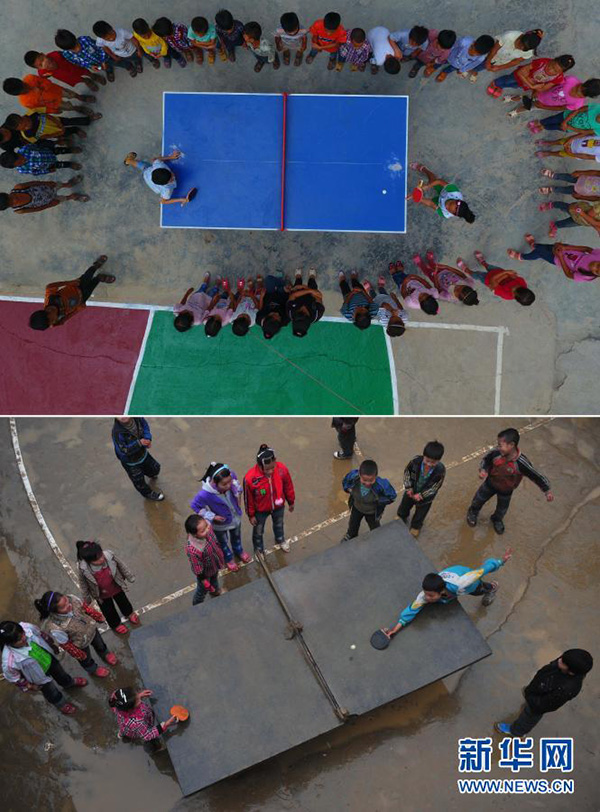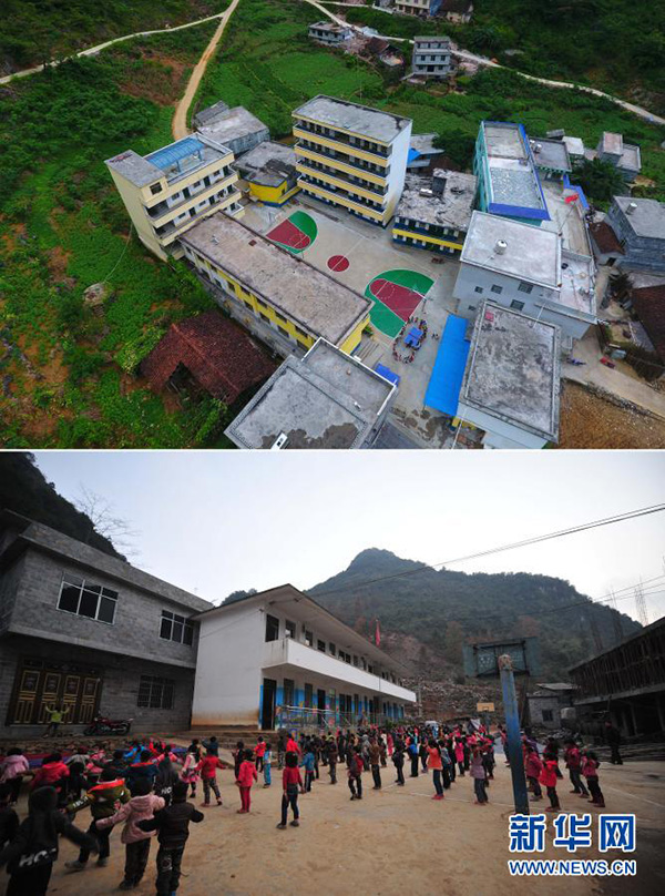 拼版照片:上圖為在廣西大化瑤族自治縣板升鄉(xiāng)弄勇小學(xué),孩子們?cè)诖蚱古仪颍?017年9月4日攝,無(wú)人機(jī)照片);下圖為在弄勇小學(xué),孩子們?cè)诖蚱古仪颍?012年12月26日攝)。(新華社記者 黃孝邦/攝)