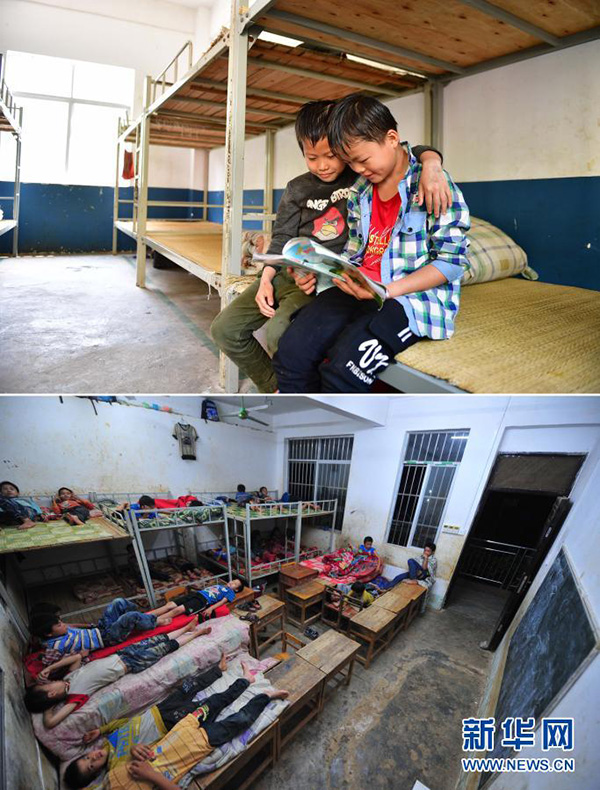 拼版照片:上圖為在廣西大化瑤族自治縣板升鄉(xiāng)弄勇小學(xué),同學(xué)們?cè)谒奚崂锟磿?019年5月10日攝);下圖為在弄勇小學(xué),同學(xué)們?cè)诮淌依锼X(2014年7月1日攝)。(新華社記者 黃孝邦/攝)