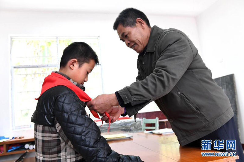 在廣西柳城縣古砦仫佬族鄉(xiāng)大巖垌村大巖垌小學(xué),老師潘善吉為該校唯一一名學(xué)生李建文系紅領(lǐng)巾(2017年12月28日攝)。(新華社記者 周華/攝)
