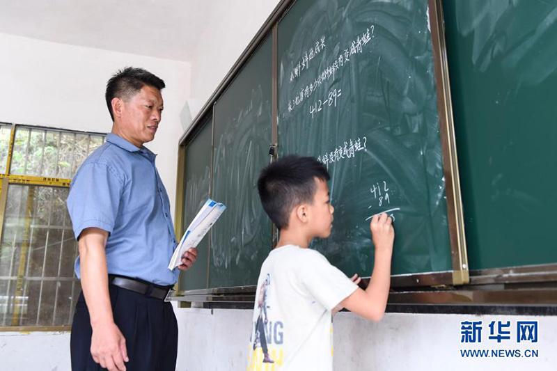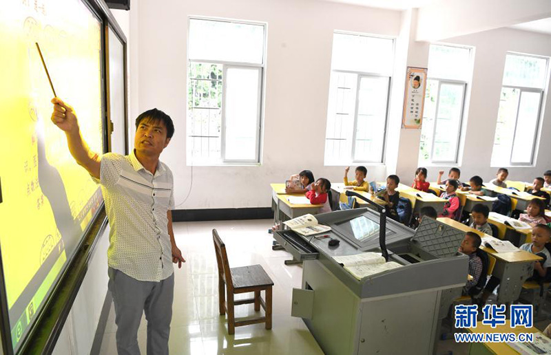 55歲的王清文老師在廣西百色市凌云縣泗城鎮(zhèn)后龍村中心小學(xué)給孩子們上課(2020年9月8日攝)。(新華社記者 周華/攝)