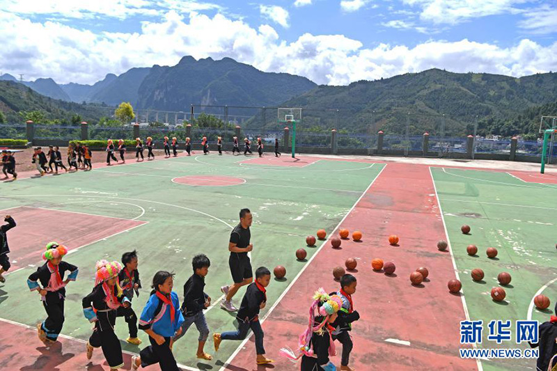 在廣西百色市凌云縣泗城鎮(zhèn)金保村覽金小學(xué),諶業(yè)權(quán)老師帶著孩子們上籃球課(2020年9月8日攝)。(新華社記者 周華/攝)
