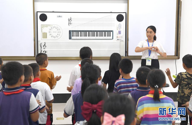 22歲的那仙老師在廣西百色市凌云縣泗城鎮(zhèn)后龍村中心小學(xué)教孩子們唱歌(2020年9月8日攝)。(新華社記者 周華/攝)