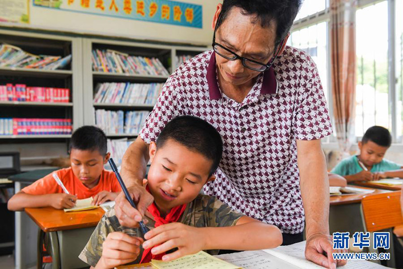 在廣西武宣縣二塘鎮(zhèn)雙桂小學(xué),鄉(xiāng)村教師韋旭禧糾正學(xué)生握筆姿勢(shì)(2020年6月19日攝)。(新華社記者 曹祎銘/攝)