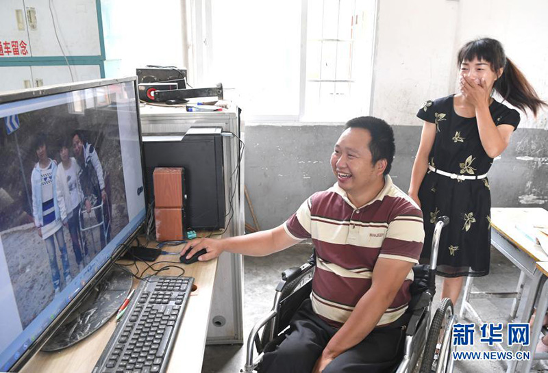 廣西百色市凌云縣下甲鎮(zhèn)河洲村念恩小學(xué)老師阮文憑給學(xué)生羅秋來(lái)看他們當(dāng)年的合影(2020年9月9日攝)。(新華社記者 周華/攝)
