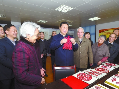 農(nóng)歷羊年春節(jié)來臨之際,2月13日至16日,中共中央總書記、國家主席、中央軍委主席習(xí)近平來到陜西,看望慰問廣大干部群眾,向全國各族人民致以新春祝福,祝偉大祖國繁榮昌盛、各族人民幸福安康。這是15日上午,習(xí)近平在西安市雁塔區(qū)電子城街道二〇五所社區(qū)服務(wù)中心,拿起一幅“三陽開泰”剪紙,祝愿全國各族人民新春愉快、羊年大吉,生活喜氣洋洋,事業(yè)蒸蒸日上。(新華社記者 李學(xué)仁攝)