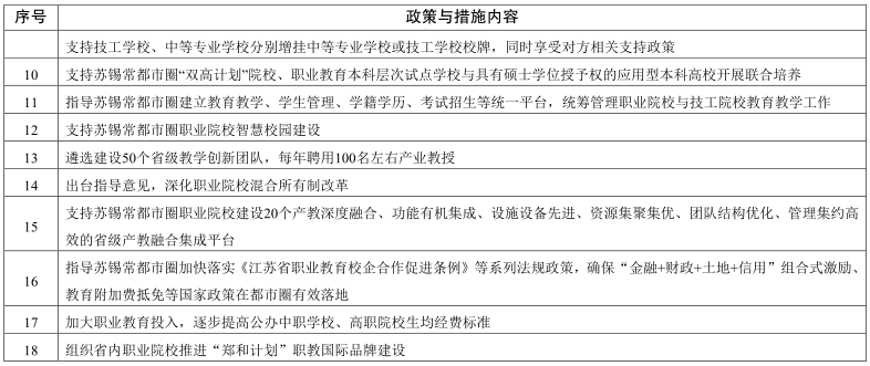 2.加大對職業(yè)教育的政策支持。江蘇省人民政府不斷加大對職業(yè)教育的支持力度,積極引導蘇錫常三市人民政府提高對職業(yè)教育的投入,設立蘇錫常都市圈職業(yè)教育建設專項經(jīng)費,提升職業(yè)院?;巨k學條件,確保蘇錫常都市圈所有職業(yè)院校到2022年全部達標。江蘇教育行政部門會同人力資源社會保障等有關部門組織清理妨礙技術技能人才成長的政策,推行職業(yè)院校畢業(yè)生在落戶、就業(yè)、參加機關事業(yè)單位招聘、職稱評審等方面與普通院校畢業(yè)生享受同等待遇,不斷提高技術技能人才的待遇。建立健全職業(yè)院校教師發(fā)展激勵機制,提高職業(yè)院校教師待遇,核增職業(yè)院??冃ЧべY總量和幅度,并在績效分配時向承擔職業(yè)技能等級證書培訓及社會服務的教師傾斜。蘇錫常都市圈職業(yè)院校教師依法取得的科技成果轉(zhuǎn)化獎勵收入不納入績效工資,不納入單位績效工資總量管理。