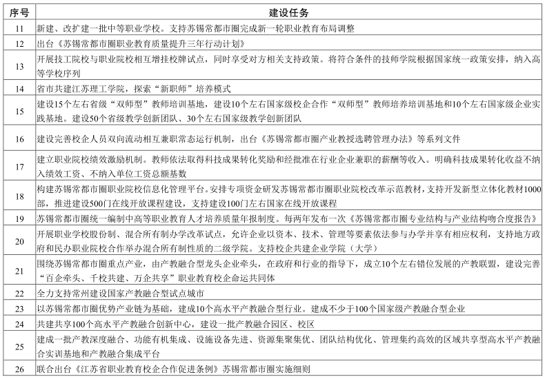 3.提升服務科技創(chuàng)新和精準扶貧的能力。蘇錫常都市圈應用型本科高校、高職院校認真落實《蘇南國家自主創(chuàng)新示范區(qū)一體化發(fā)展實施方案(2020-2022年)》,聚焦集成電路、生物醫(yī)藥、人工智能等重要領域和關鍵環(huán)節(jié),聯(lián)合打造蘇錫常都市圈產(chǎn)業(yè)技術創(chuàng)新平臺和科技公共服務平臺,促進制造業(yè)向研發(fā)、設計創(chuàng)意等高端環(huán)節(jié)延伸,推動優(yōu)勢制造業(yè)品牌化發(fā)展。對接蘇州國際精英創(chuàng)業(yè)周、全球菁英人才節(jié)、無錫才交會等交流活動,培養(yǎng)未來產(chǎn)業(yè)變革的“高精尖缺”和“卡脖子”領域人才。蘇錫常都市圈職業(yè)院校結(jié)對幫扶蘇北職業(yè)教育薄弱地區(qū)學校,組團支援新疆、西藏、青海、陜西、貴州、云南等中西部職業(yè)教育薄弱地區(qū)。