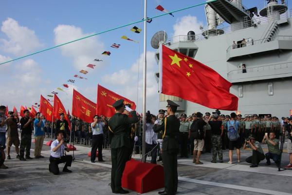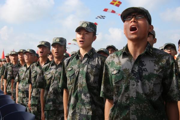 在仿真航空母艦的頂樓,來自全國30個(gè)省、自治區(qū)、直轄市和新疆生產(chǎn)建設(shè)兵團(tuán)600余人的代表隊(duì)參加了2016第三屆全國學(xué)生軍事訓(xùn)練營開營儀式。開幕式過程中,軍事訓(xùn)練營的營員烈日下暴曬兩個(gè)多小時(shí),卻沒有一個(gè)人提前離位。