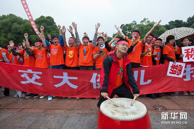 5月20日,在上海市青少年校外活動營地東方綠舟,上海交大的學(xué)生為自己學(xué)校加油。(新華社記者 金立旺 攝)